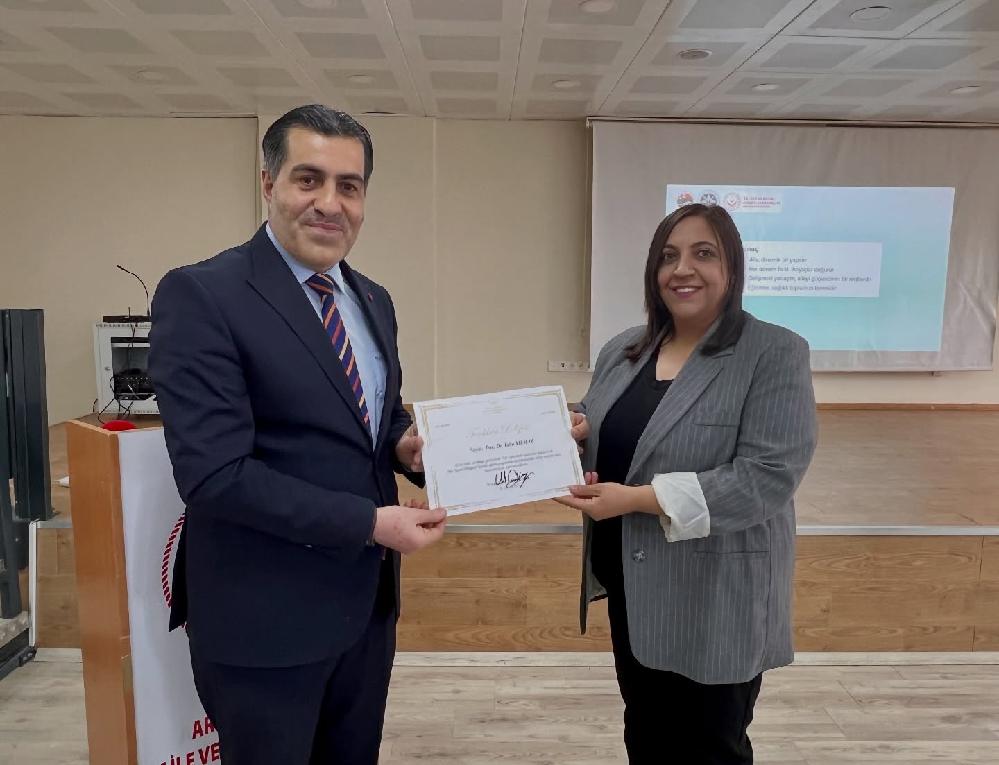 İl Müdürlüğü ve bağlı kuruluşlarda görev yapan personellere yönelik olarak, Yerel Eğitim Programları kapsamında “Aile Eğitiminde Gelişimsel Yaklaşımlar ve Aile Yaşam Döngüsü” konulu eğitim gerçekleştirilmiştir. Eğitime sağladığı değerli katkılardan dolayı Doç. Dr. Taha Yılmaz’a teşekkür belgesi İl Müdür Yardımcısı Zehra Ulutaş tarafından takdim edilmiştir.